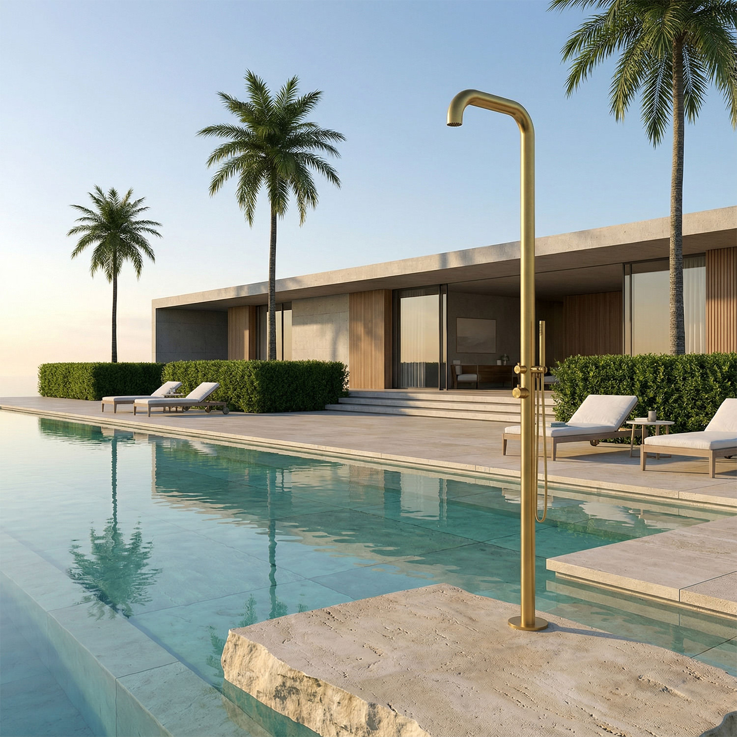 La Doccia CHIA di SINED, ora esaltata in un lussuoso colore oro, segna un nuovo standard nel design degli spazi esterni. Realizzata in Acciaio Inox Nautico 316L, questa doccia non solo risplende per il suo aspetto ma anche per la sua qualità superiore, adattandosi magnificamente sia a contesti commerciali che privati. È l’opzione prediletta per arricchire piscine, giardini, bagni domestici, SPA e stazioni termali, offrendo la praticità di un’erogazione di acqua sia calda che fredda.