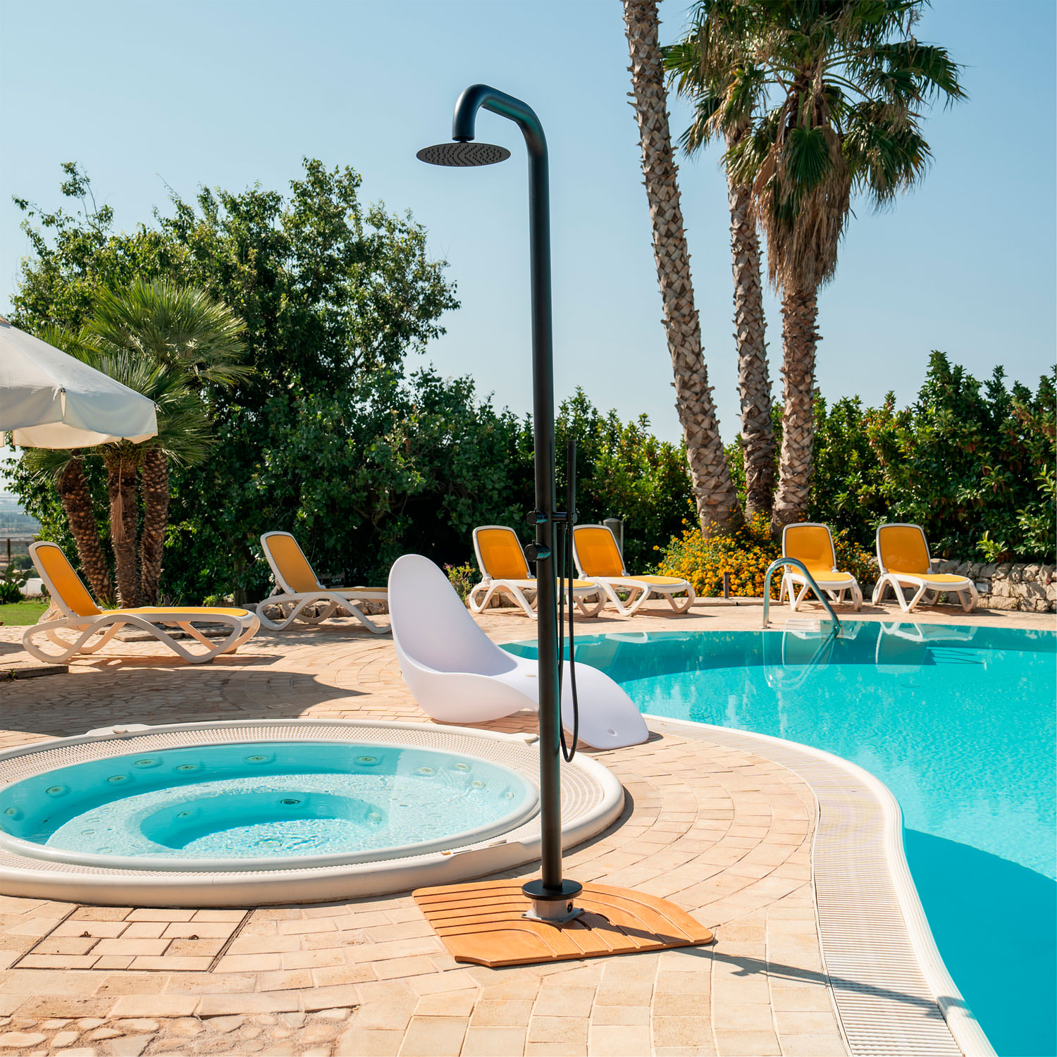 - Versatilità di Utilizzo: Con un doppio miscelatore, la doccia PULA consente l’accesso sia all’acqua calda che fredda dal soffione principale e dal doccino mobile. Questo la rende estremamente pratica sia in contesti domestici che commerciali, adattandosi perfettamente a piscine, giardini, SPA e stazioni termali.