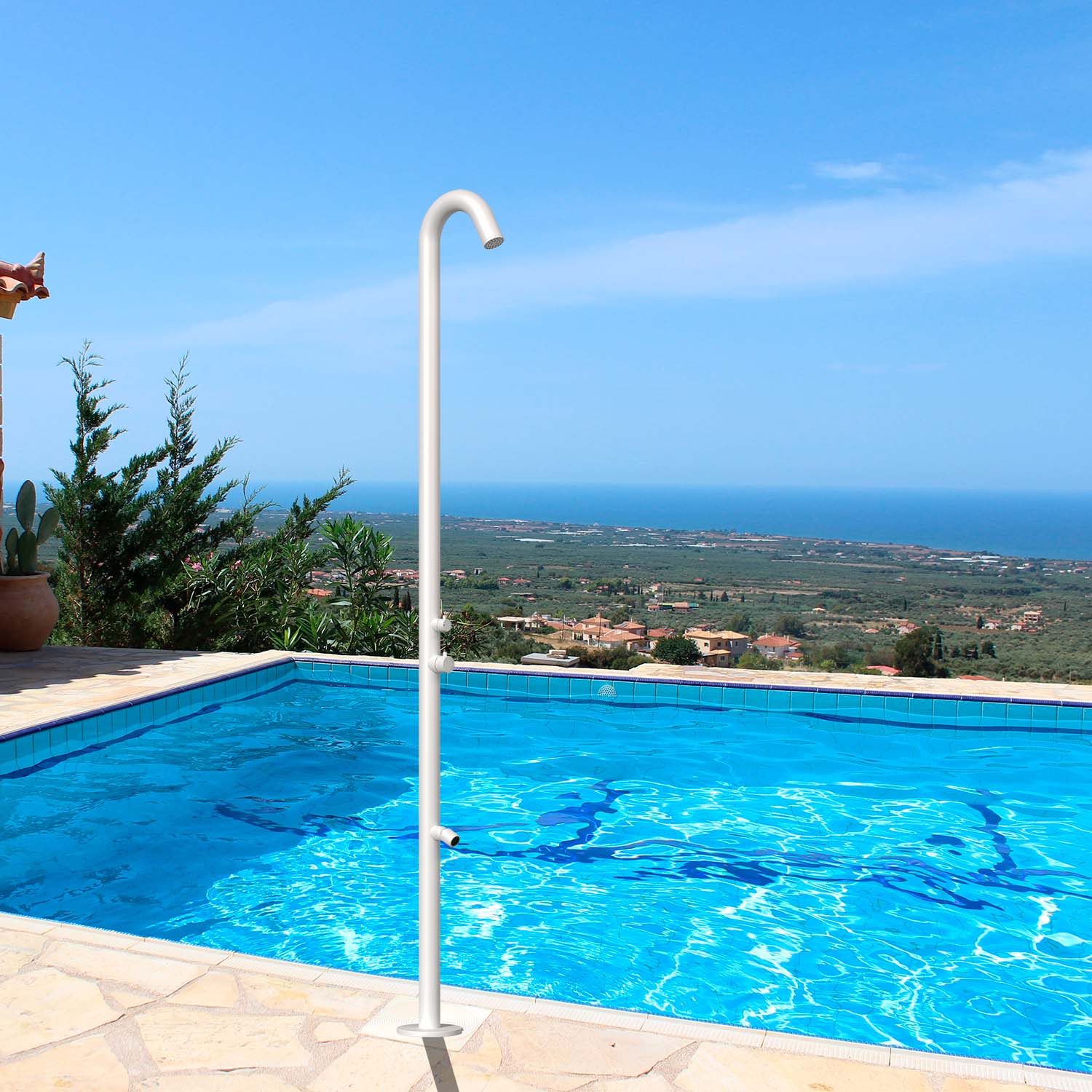 - Design Elegante e Funzionale: Con un’altezza di 228.9 cm e un diametro di 6 cm, la nostra doccia si distingue per il suo design raffinato e la finitura in bianco opaco. Questo non solo la rende un elemento di spicco in qualsiasi ambiente esterno ma assicura anche che si integri armoniosamente, elevando l’estetica dello spazio circostante.
